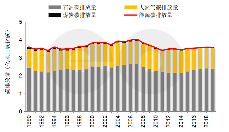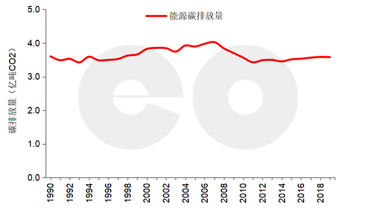 近30年來,碳排放量在峰值附近窄幅波動(dòng)。能源碳排放量與化石能源消費(fèi)量及結(jié)構(gòu)相關(guān)。目前碳排放量為峰值年的89%,與1990年相當(dāng);2007年至今碳排放量年均下降1%。總體上看,近30年碳排放量波動(dòng)較?。ㄒ妶D3)。未來,碳排放量雖然會(huì)有所波動(dòng),但都將處于下降通道。