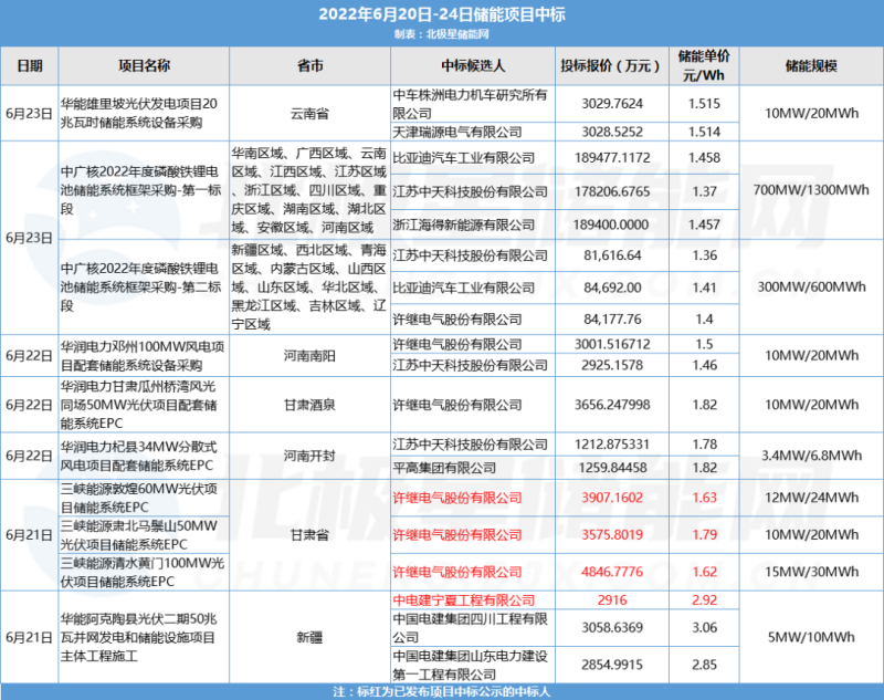 6月23日,中廣核風(fēng)電有限公司發(fā)布2022年度磷酸鐵鋰電池儲能系統(tǒng)框架采購第二標段中標候選人公示。第一候選人為江蘇中天科技股份有限公司,投標價格為81616.638672萬元,投標單價1.36元/Wh。第二候選人為比亞迪汽車工業(yè)有限公司,投標價格為84692.001006萬元,投標單價1.41元/Wh。第三候選人為許繼電氣股份有限公司,投標價格為84177.7600萬元,投標單價1.4元/Wh。
