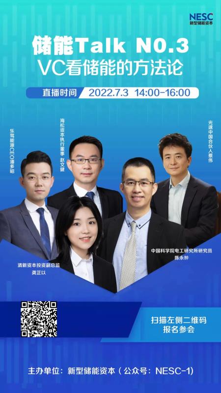 中國儲能網(wǎng)訊:7月3日下午14:00-16:00,我們將邀請清新資本投資副總監(jiān)龔芷以做“VC看儲能的方法論”主題演講,并邀請光速中國合伙人蔡偉、海松資本執(zhí)行董事趙文健、樂駕能源CEO潘多昭和中國化學與物理電源學會儲能應用分會副秘書長、中科院電工所研究員陳永翀來做對話討論。