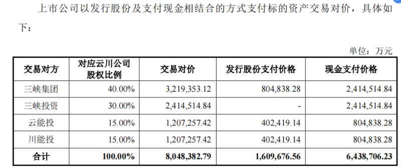 6月30日晚間,長(zhǎng)江電力(SH600900,收盤(pán)價(jià)23.12元,市值5258億元)發(fā)布了購(gòu)買(mǎi)資產(chǎn)交易報(bào)告書(shū),公司擬以發(fā)行股份及支付現(xiàn)金的方式購(gòu)買(mǎi)三峽集團(tuán)、三峽投資、云能投、川能投合計(jì)持有的三峽金沙江云川水電開(kāi)發(fā)有限公司(以下簡(jiǎn)稱(chēng)“云川水電”)100%股權(quán),交易作價(jià)804.84億元。