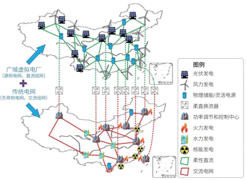 1. 考慮到大量可再生能源按照傳統(tǒng)模式接入現(xiàn)有電網(wǎng)所帶來的系列挑戰(zhàn),可以構(gòu)建覆蓋一個全國范圍內(nèi)統(tǒng)一的柔性直流電網(wǎng),將我國主要的光伏電站、風電場、部分物理儲能電站通過柔性直流換流器接入該電網(wǎng),以最大程度上利用廣域可再生能源的時空互補性,從而形成基于可再生能源的廣域源側(cè)電網(wǎng);該源側(cè)電網(wǎng)實際上也可以視為一個廣域虛擬電廠。