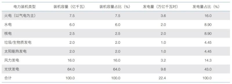 在上述光伏發(fā)電和風力發(fā)電總裝機中,假設(shè)光伏發(fā)電占比 80%(64 億千瓦)、風力發(fā)電占比 20%(16 億千瓦),可以得到如表 1 所示的 2060 年我國電源裝機及發(fā)電量預測表。