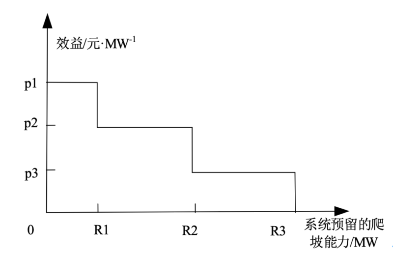 為了在出清模型中綜合考慮爬坡產(chǎn)品帶來的效益和系統(tǒng)發(fā)電成本,CAISO根據(jù)凈負(fù)荷波動的概率和失負(fù)荷價(jià)值提出了分段爬坡效益曲線,如圖4所示。系統(tǒng)出現(xiàn)0-R1的凈負(fù)荷較小幅度波動的可能性較大,因此預(yù)留的爬坡容量效益也較高。隨著系統(tǒng)預(yù)留的爬坡容量增大,其可以應(yīng)對的凈負(fù)荷大幅波動概率也降低,因此產(chǎn)生的效益逐漸減小。