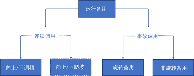 2016年,MISO和CAISO的可再生能源裝機(jī)占比分別達(dá)到了11.6%和40.5%,發(fā)電占比分別為6.9%和20.9%。同年,兩個(gè)市場運(yùn)營機(jī)構(gòu)均建立了爬坡市場。功能上,爬坡產(chǎn)品隸屬于運(yùn)行備用范疇,與其他輔助服務(wù)的關(guān)系如圖1所示。事故備用通常在出現(xiàn)概率低但影響重大的突發(fā)情況下被調(diào)用,而調(diào)頻和爬坡在正常運(yùn)行狀態(tài)下被連續(xù)的調(diào)用。調(diào)頻資源通過AGC跟蹤響應(yīng)實(shí)時(shí)偏差,而爬坡資源在5-15min內(nèi)根據(jù)調(diào)度指令進(jìn)行出力,兩者在響應(yīng)時(shí)間、作用方式上存在不同。