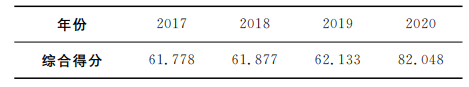 根據(jù)各項指標得分,計算可得評價對象歷年最終得分,從綜合得分來看,該工程前3年得分較低,但2020年得分顯著提高,達到822.048分,這主要是2017~2019年間,多能源協(xié)調控制設備正處于準備建設階段,尚未投入使用,綜合多能源利用系統(tǒng)正處于搭建階段,許多預測協(xié)調控制功能尚未實現(xiàn),因而綜合評價得分偏低。