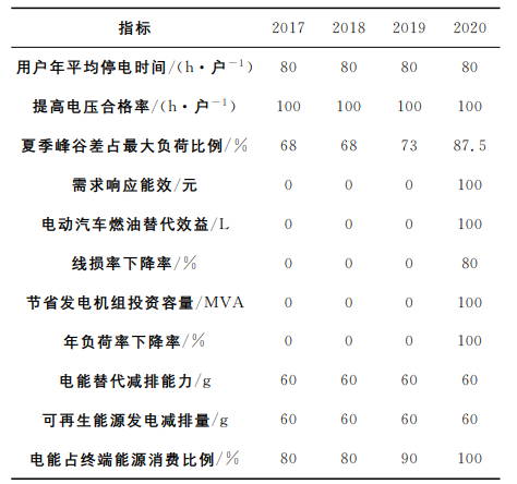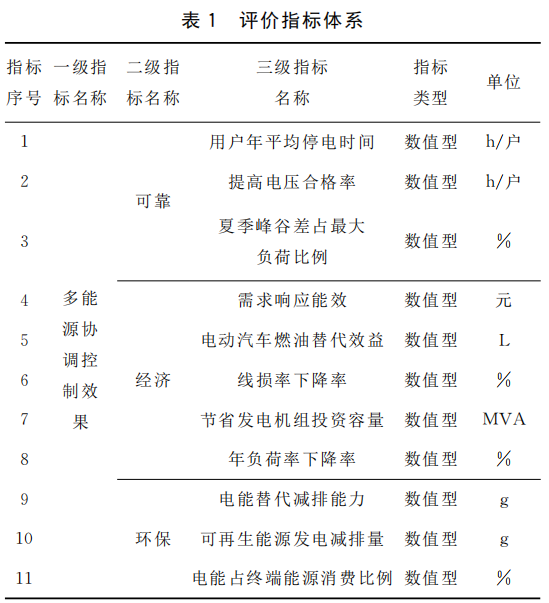 智慧能源多級調控的效果是從安全可靠、優(yōu)質經(jīng)濟和節(jié)能環(huán)保等方面進行評價的。安全可靠主要是指電力系統(tǒng)運行的穩(wěn)定性,具體表現(xiàn)為電力系統(tǒng)在故障時間內停電范圍以及停電時間、削峰填谷的響應效果;優(yōu)質經(jīng)濟主要是指系統(tǒng)在運行期間電能質量以及系統(tǒng)的運行成本,主要能夠以可再生能源技術電網(wǎng)的并網(wǎng)水平以及系統(tǒng)總成本進行量化;節(jié)能環(huán)保是指整個系統(tǒng)的碳排放水平一級節(jié)能減排效果,主要可以利用可再生能源發(fā)電以及電動汽車保有量水平進行環(huán)境影響效果評價。