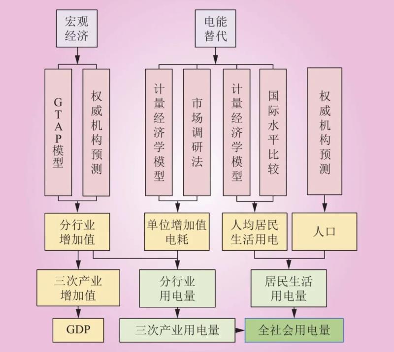 (3)全社會(huì)用電量根據(jù)各部門(mén)預(yù)測(cè)結(jié)果匯總?;诜中袠I(yè)用電量,按照行業(yè)屬性求和計(jì)算三次產(chǎn)業(yè)用電量,再結(jié)合居民生活用電量,得到“十四五”期間中國(guó)全社會(huì)用電量預(yù)測(cè)結(jié)果。