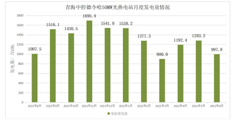 在隨后的運(yùn)行中,電站屢次突破單日、單月運(yùn)行紀(jì)錄,期間也出現(xiàn)過熔鹽吸熱器凍堵、冷鹽泵震動過大、汽輪機(jī)三次返廠檢修等問題,但經(jīng)過各方努力,目前都已得到較好解決。自2021年8月5日汽輪機(jī)及主蒸汽管道最后一次整改完成后,11個月來一直穩(wěn)定運(yùn)行,而且提前一個月實現(xiàn)了實際發(fā)電量超過年設(shè)計發(fā)電量(1.46億kWh)的優(yōu)秀運(yùn)行業(yè)績,成為全國乃至全球首個年度實際發(fā)電量完全達(dá)到并超過年設(shè)計發(fā)電量的塔式熔鹽儲能光熱電站。