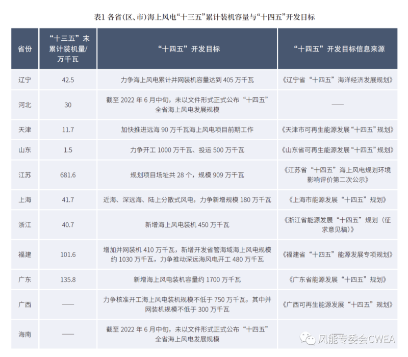據(jù)統(tǒng)計,截至2022年6月中旬,我國共有9個省(區(qū)、市)通過文件形式公布或征求過“十四五”海上風(fēng)電的具體發(fā)展規(guī)模相關(guān)意見。另有1個省份通過非正式下發(fā)文件的形式,透露自身的“十四五”海上風(fēng)電發(fā)展規(guī)模。為方便讀者參考,本文對各?。▍^(qū)、市)“十四五”海上風(fēng)電裝機(jī)規(guī)模的具體目標(biāo)進(jìn)行了整理與匯編。