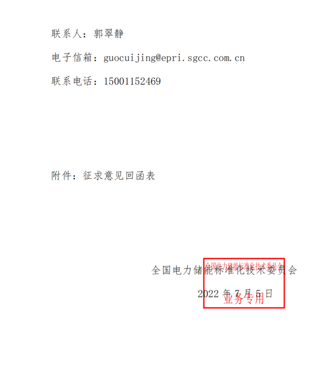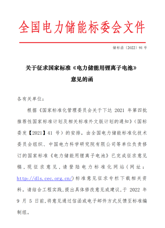 關(guān)于征求國家標準《電力儲能用鋰離子電池》意見的函