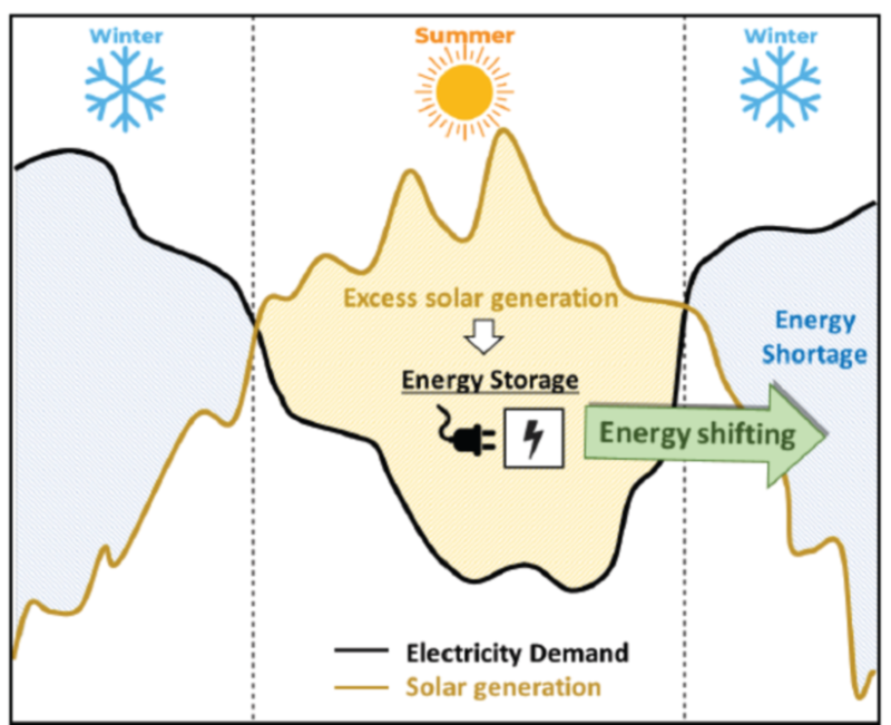 圖2 歐洲一年內(nèi)的電力需求(黑線)和太陽能發(fā)電設(shè)施供電(黃線)的季節(jié)性相關(guān)性。黃色陰影表示使用儲(chǔ)能技術(shù)存儲(chǔ)的多余太陽能發(fā)電量,這種電力的使用被“轉(zhuǎn)移”以滿足冬季的高需求。