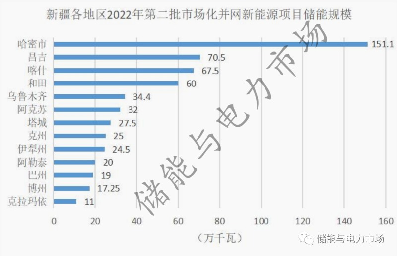從分布地區(qū)上看,共共涉及伊犁州、昌吉州、哈密市、吐魯番市、巴州、阿克蘇地區(qū)、克州、喀什地區(qū)、和田地區(qū)、博州、烏魯木齊市、塔城地區(qū)、阿勒泰地區(qū)、克拉瑪依市14個州、市、地區(qū)。其中哈密市規(guī)模最大,電化學(xué)儲能規(guī)模達(dá)1511MW/5714MWh。
