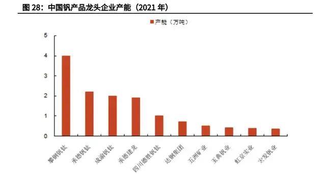 據(jù)某機構(gòu)統(tǒng)計,國內(nèi)釩產(chǎn)品產(chǎn)能合計 17.14 萬噸(2021 年底),釩產(chǎn)品生產(chǎn)的前十大企業(yè)分別是攀鋼釩鈦、承德釩鈦、成渝釩鈦、承德建龍、四川德勝釩鈦、 達鋼集團、五洲礦業(yè)、玉典釩業(yè)、虹京實業(yè)、宏發(fā)釩業(yè)。