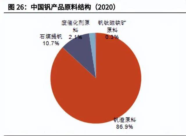 原料及工藝:國際以釩鈦磁鐵礦為主,國內(nèi)以釩渣為主 。釩的地殼豐度雖然較高,但卻主要與其他礦物形成共生礦或者復合礦,獨立 釩礦較少見。目前世界上發(fā)現(xiàn)的含釩礦物有 70 多種,釩礦主要有以下三種:(1)釩鈦磁鐵礦:釩鈦磁鐵礦中的釩主要以 FeO·V2O3 尖晶石形態(tài)存在, 礦中含釩 0.2%~1.5%。除美國外,主要產(chǎn)釩國家都是從釩鈦磁鐵礦中提取釩。(2)鉀釩鈾礦:鉀釩鈾礦是一種鉀鈾的釩酸絡鹽,它的化學式為 K2O·2UO3·V2O5·1~3H2O,呈淺黃色或淺綠黃色,其中五氧化二釩含量可達 20.16%,美國是這種礦物的主要產(chǎn)地。(3)石油伴生礦:石油伴生礦寄生在原油中,主要分布于南美洲。據(jù)吳優(yōu)等人發(fā)布的《2020 年全球釩工業(yè)發(fā)展報告》,世界釩產(chǎn)品原料的絕 大部分均來自于釩鈦磁鐵礦,大多數(shù)國家都是通過釩鈦磁鐵礦在煉鋼的時候,從 含釩鋼渣中繼續(xù)提煉釩,包括中國、俄羅斯等,而美國主要從石油渣、煤灰、廢 催化劑等中提煉。2020 年全球約 74.8%的釩來自于釩鈦磁鐵礦經(jīng)鋼鐵冶煉后得到的富釩鋼渣,直接從釩鈦磁鐵礦提取釩的占比 13.8%,11%由回收的含釩副 產(chǎn)品(含釩燃油灰渣、廢化學催化劑等)及含釩石煤提取。
