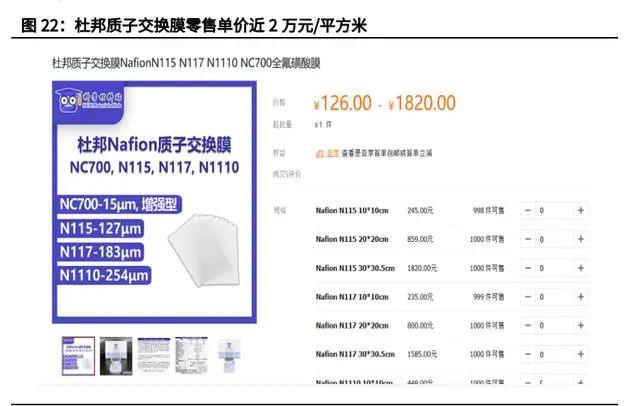 2)國產(chǎn)材料替代帶動成本下降 。在離子交換膜方面,目前全球釩電池主要使用美國杜邦公司的 Nafion 全氟 磺酸樹脂交換膜,Nafion 薄膜以磺酸基團為交換基團,作為全釩氧化還原液流 電池的標準隔膜,其在電解液中的穩(wěn)定性高,但價格昂貴,據(jù)阿里巴巴 1688 網(wǎng), 零售單價近 20000 元/平方米。目前,國內(nèi)的科潤、東岳、中科院大化所,國外的戈爾等都在自主創(chuàng)新開發(fā) 了更低成本的膜。隨著國產(chǎn)離子交換膜的逐步推廣,膜等產(chǎn)品仍有較大成本下降 空間,預計后續(xù)在其他電堆材料(雙極板、碳氈等)也有成本優(yōu)化空間。