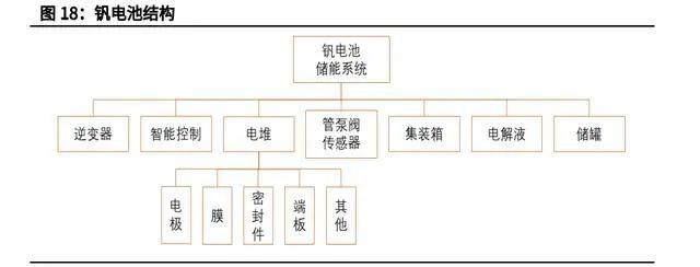 整個釩電池儲能系統(tǒng)主要由電堆、電解液、逆變器、智能控制、儲罐、集裝 箱、管泵閥傳感器幾部分構(gòu)成。釩電池最主要的核心部件就是電堆和電解液,其 中電解液的成分一般為五氧化二釩,也是整個釩電池系統(tǒng)中釩產(chǎn)品的主要用途。