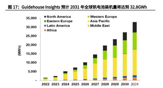 Guidehouse Insights 于 2022 年二季度發(fā)布的《Vanadium Redox Flow Batteries :Identifyting Market Opportunities and Enablers》報告顯示, 2022-2031 年釩電池年裝機量有望保持 41%的復合增長率,預計 2031 年全球釩電池年裝機量將達到 32.8GWh;其中,2031年亞太地區(qū)(主要為中國)年裝機 量將達到約 14.5GWh,北美地區(qū)將達到 5.8GWh,西歐地區(qū)將達到 9.3GWh。