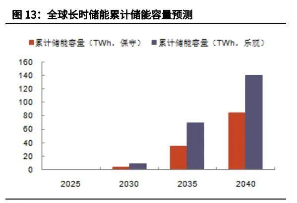 長時儲能委員會與麥肯錫合作發(fā)布《Net-zero power:Long duration energy storage for a renewable grid》(2021 年 11 月)顯示,已投入運營或 已宣布部署的長時儲能系統(tǒng)超過 5GW 和 65GWh,全球已公示超過 230 個處于 不同商業(yè)階段的長時儲能項目(不包括抽水蓄能)。預計,長時儲能的潛在市場空間將從 2025 年開始大規(guī)模增長。隨 著可再生能源占比提升,2025 年長時儲能全球累計裝機量將達到 30-40 GW(對 應儲能容量約 1TWh),累計投資額約 500 億美元。2030 年起全球可再生能源滲透率將升至約 60%-70%,長時儲能累計裝機 量將達到 150-400GW(對應儲能容量 5-10TWh),累計投資規(guī)模將達到 2000-5000 億美元。到 2040 年,長時儲能累計裝機量將加速達到 1.5 -2.5 TW (對應儲能容量 85-140TWh),是目前全球儲能系統(tǒng)裝機量的 8-15 倍,累計投 資額將達到 1.5-3 萬億美元。
