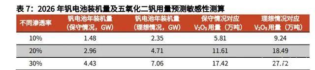 按照保守、理想兩種場景和釩電池在新型儲能中 10%、20%、30%的滲透率測算,2026 年釩電池年裝機量的范圍是 1.48GW-7.06GW。取中值 20%計算, 保守和理想兩種情形下,年裝機量分別為 2.96GW 和 4.71GW,按照單 GWh 電 池消耗 5500 噸釩(折五氧化二釩 9821.4 噸)估算,2026 年對五氧化二釩的需 求拉動約 11.61 萬噸和 18.49 萬噸(假設 4 小時儲能時長),2021 年中國金屬釩產(chǎn)量折五氧化二釩產(chǎn)量約 13.1 萬噸。若釩資源后續(xù)開發(fā)力度不及 預期,或?qū)︹C價有明顯的拉動,進而影響釩電池電解液成本。