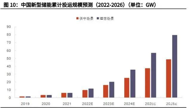 預計 2026年我國新型儲能累計裝機規(guī)模達到 48.5GW 和 79.5GW(分別為 保守和理想情況)。據(jù)數(shù)據(jù)統(tǒng)計, 2021年我國新型儲能累計裝機規(guī)模為 5.73GW。據(jù) CNESA 的預測,在保守場景下,到 2026年新型儲能累計規(guī)模達到 48.5GW,2021-2026 年的復合年均增長率為 53.3%;理想場景下,累計裝機將 達到 79.5GW,2021-2026 年的復合年均增長率為 69.2%。