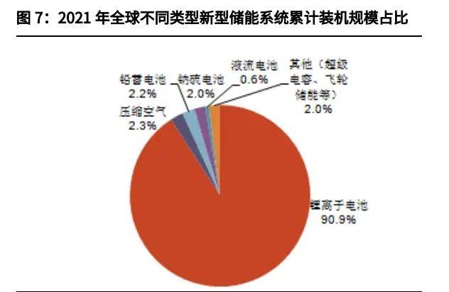 根據(jù) CESA 儲能應用分會于 2022 年 4 月發(fā)布的《2022 年儲能產(chǎn)業(yè)應用研究報告》,截 至 2021 年底,已投運的全球儲能項目累計裝機規(guī)模為 209.4GW,同比增長 9%。其中,規(guī)模最大的是抽水儲能,累計裝機規(guī)模約 180.5GW,占比 86.2%,較 2020 年底下降 4.1 個百分點。新型儲能(除抽水蓄能和熔融鹽儲熱儲能以外的儲能方式,包括鋰離子電池、 鉛蓄電池、鈉硫電池、壓縮空氣、液流電池、超級電容和飛輪儲能等)累計裝機 規(guī)模為 25.4GW,同比增長 67.7%,占比 12.2%。新型儲能中,鋰離子電池仍占 據(jù)主導地位,累計裝機規(guī)模占比達 90.9%;壓縮空氣儲能占比 2.3%,鉛蓄電池 占比 2.2%;鈉硫電池占比 2.0%;液流電池占比為 0.6%。