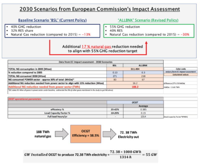歐盟的影響評(píng)估研究表明,要實(shí)現(xiàn)情景中修訂后的減少55%溫室氣體的目標(biāo),需要將天然氣總發(fā)電量減少30%(與2015年相比)。這意味著到2030年,與基本情景相比,需要將天然氣發(fā)電用量再減少17%,才能實(shí)現(xiàn)減少55%的溫室氣體的目標(biāo)。如上所述,歐盟對(duì)2020年儲(chǔ)能的研究基于過(guò)時(shí)的目標(biāo),因此認(rèn)為到2030年仍有不成比例的天然氣發(fā)電廠提供靈活性。