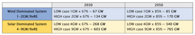 表1使用參考文獻(xiàn)計(jì)算的儲(chǔ)能功率容量,2030年67%的可再生能源發(fā)電份額和2050年85%的份額