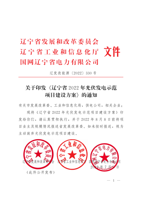 中國(guó)儲(chǔ)能網(wǎng)訊:7月12日,遼寧省發(fā)展和改革委員會(huì)、遼寧省工業(yè)和信息化廳、國(guó)網(wǎng)遼寧省電力有限公司聯(lián)合發(fā)布了《遼寧省2022年光伏發(fā)電示范項(xiàng)目建設(shè)方案》。文件指出結(jié)合各地資源稟賦和發(fā)展?jié)摿?安排光伏示范項(xiàng)目建設(shè)總規(guī)模60萬(wàn)千瓦。其中阜新治沙光伏項(xiàng)目50萬(wàn)千瓦、大連灘涂光伏項(xiàng)目10萬(wàn)千瓦。