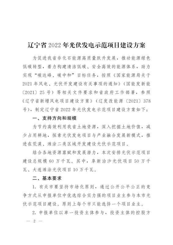在5月13日發(fā)布的遼寧省《2022年光伏發(fā)電示范項(xiàng)目建設(shè)方案》征求意見方案中,光伏示范項(xiàng)目建設(shè)總規(guī)模80萬(wàn)千瓦,包括阜新治沙光伏項(xiàng)目50萬(wàn)千瓦、盤錦水面光伏項(xiàng)目20萬(wàn)千瓦、大連灘涂光伏項(xiàng)目10萬(wàn)千瓦。