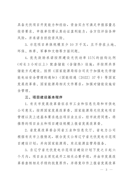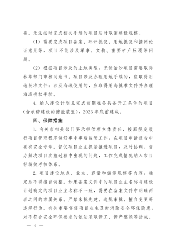 同時(shí)要求示范項(xiàng)目單體規(guī)模至少10萬(wàn)千瓦,且不存在土地、環(huán)保、林草、軍事和文物等方面問題。優(yōu)先鼓勵(lì)承諾按照建設(shè)光伏功率15%的掛鉤比例(時(shí)長(zhǎng)3小時(shí)以上)配套儲(chǔ)能(含儲(chǔ)熱)設(shè)施,并按照共享儲(chǔ)能方式建設(shè)。納入建設(shè)計(jì)劃且完成前期準(zhǔn)備具備開工條件的項(xiàng)目(含承諾建設(shè)的儲(chǔ)能裝置),2023年底前建成。