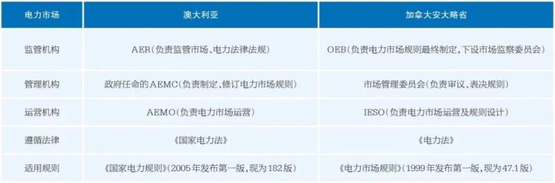國內(nèi)可能很難理解澳大利亞和加拿大安大略省電力市場規(guī)則的高頻率、短周期更迭,但恰恰是在此頻繁更改之下,其市場逐漸趨于成熟與完善。澳大利亞、加拿大電力市場的成功很大程度上來源于健全的合理的規(guī)則管理機制,澳加兩國分別通過《國家電力法》《電力法》明確電力市場規(guī)則的管理機構(gòu)及職責(zé),為規(guī)則建立及落實提供了強有力的法律依據(jù),同時制定了市場規(guī)則修編流程,規(guī)定了規(guī)則快速修訂機制,促進電力市場規(guī)則不斷完善,推動電力市場良好運轉(zhuǎn)(見表所示)。