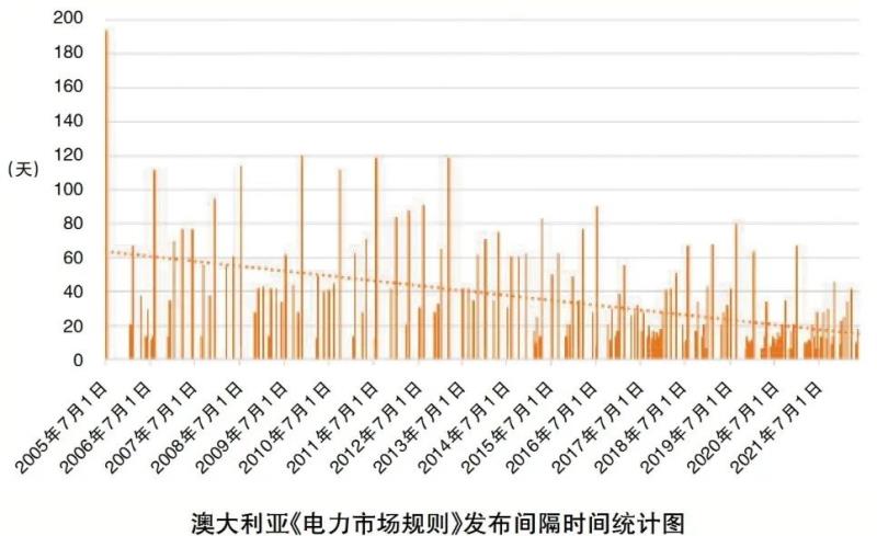 國際上,成熟市場擁有良好的規(guī)則管理機制和經(jīng)驗。澳大利亞依據(jù)“維護消費者利益,兼顧能源價格和質(zhì)量,保障安全可靠供應(yīng)”的原則修編《國家電力規(guī)則》。自2005年實施以來,《國家電力規(guī)則》已發(fā)布182版,平均適用時間約34天,規(guī)則最長更新周期為194天(第一次修訂),最短僅為1天(見下圖)。近年來,隨著市場的不斷完善,規(guī)則發(fā)布周期越來越短。加拿大安大略省遵循“效率、公平、公開、全面、可靠性和可執(zhí)行性”原則對《電力市場規(guī)則》進行編制和修改,于1999年發(fā)布首版,現(xiàn)行規(guī)則采用的是2022年6月1日發(fā)布的第47.1版。規(guī)則中,“xx.1”表示此版本為批準的有效版本,“xx.0”表示此版本中含有建議修改的條文,最終條文由待獨立電力系統(tǒng)運營商(Independent Electricity System Operator,IESO)董事會批準生效。根據(jù)IESO網(wǎng)站發(fā)布的信息,《電力市場規(guī)則》半年修訂一次,基本固定于每年6月、12月的月初向市場主體公布并執(zhí)行。