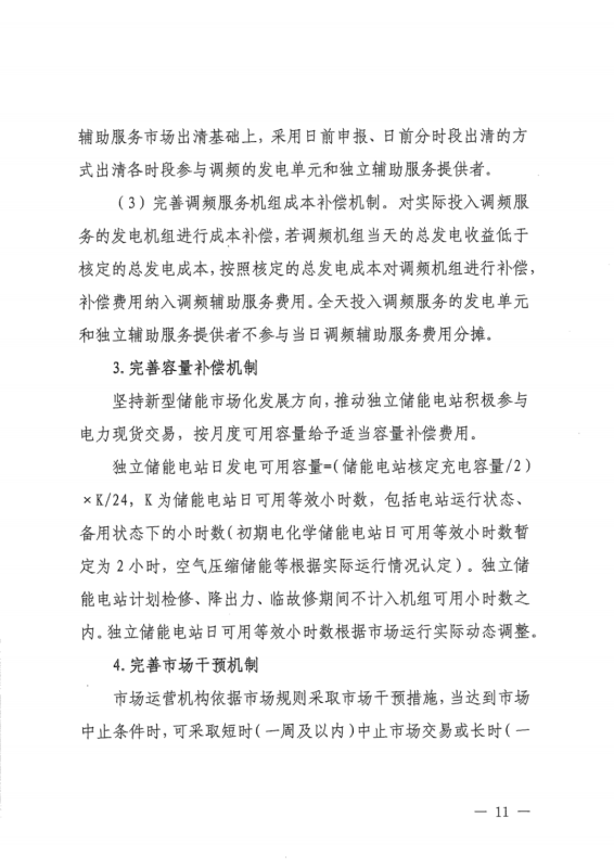 《通知》指出,要完善容量補(bǔ)償機(jī)制。堅(jiān)持新型儲(chǔ)能市場(chǎng)化發(fā)展方向,推動(dòng)獨(dú)立儲(chǔ)能電站積極參與電力現(xiàn)貨交易,按月度可用容量給予適當(dāng)容量補(bǔ)償費(fèi)用。獨(dú)立儲(chǔ)能電站日發(fā)電可用容量=(儲(chǔ)能電站核定充電容量/2)xK/24,K為儲(chǔ)能電站日可用等效小時(shí)數(shù),包括電站運(yùn)行狀態(tài)、備用狀態(tài)下的小時(shí)數(shù)(初期電化學(xué)儲(chǔ)能電站日可用等效小時(shí)數(shù)暫定為2小時(shí),空氣壓縮儲(chǔ)能等根據(jù)實(shí)際運(yùn)行情況認(rèn)定)。獨(dú)立儲(chǔ)能電站計(jì)劃?rùn)z修、降出力、臨故修期間不計(jì)入機(jī)組可用小時(shí)數(shù)之內(nèi)。獨(dú)立儲(chǔ)能電站日可用等效小時(shí)數(shù)根據(jù)市場(chǎng)運(yùn)行實(shí)際動(dòng)態(tài)調(diào)整。