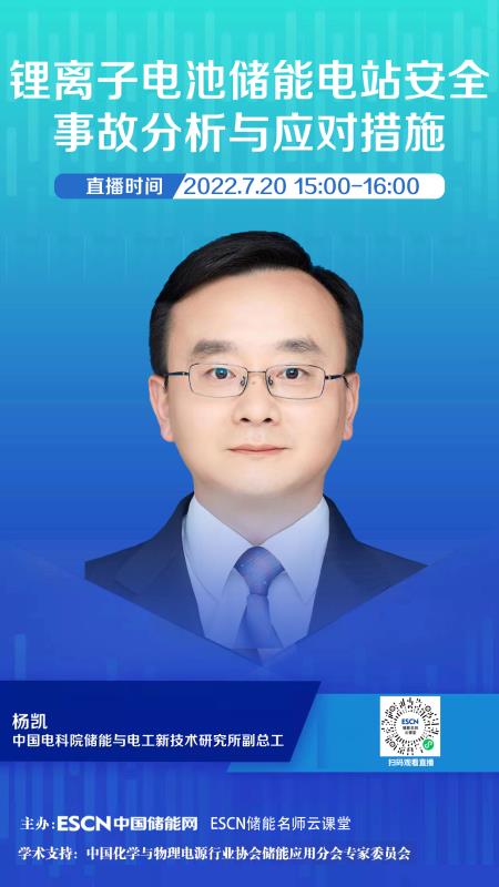 7月20日下午15:00-16:00,中國儲(chǔ)能網(wǎng)邀請(qǐng)中國電科院儲(chǔ)能與電工新技術(shù)研究所副總工楊凱博士做客“ESCN儲(chǔ)能名師云課堂”(在線直播),為大家分享《鋰離子電池儲(chǔ)能電站安全事故分析與應(yīng)對(duì)措施》主題報(bào)告。歡迎業(yè)界同仁在線學(xué)習(xí)與交流。