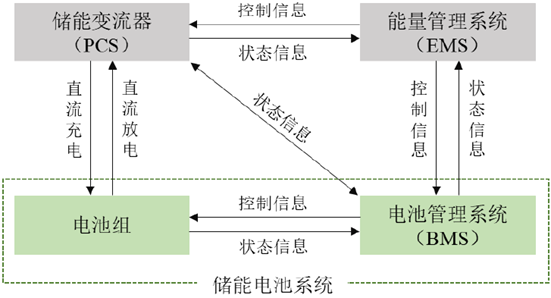 電池組將狀態(tài)信息反饋給電池管理系統(tǒng)BMS,BMS將其共享給能源管理系統(tǒng)EMS和儲(chǔ)能變流器PCS;EMS根據(jù)優(yōu)化及調(diào)度決策將控制信息下發(fā)至PCS與BMS,控制單體電池/電池組完成充放電等。