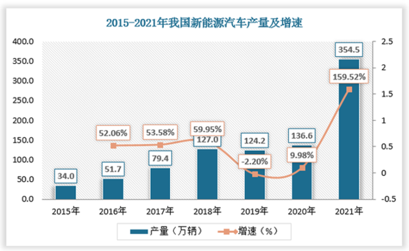 2015-2021年我國(guó)新能源汽車(chē)產(chǎn)量及增速