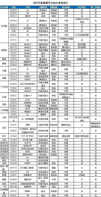 2021年部分新能源汽車(chē)火災(zāi)事故統(tǒng)計(jì)