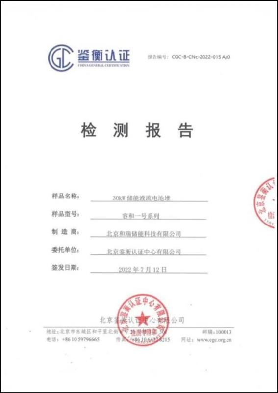 中國儲(chǔ)能網(wǎng)訊:日前,北京和瑞儲(chǔ)能科技有限公司(以下簡(jiǎn)稱“和瑞儲(chǔ)能”)“容和一號(hào)®”鐵-鉻液流電池堆順利通過第三方權(quán)威機(jī)構(gòu)北京鑒衡認(rèn)證中心(CGC)開展的產(chǎn)品檢測(cè)。