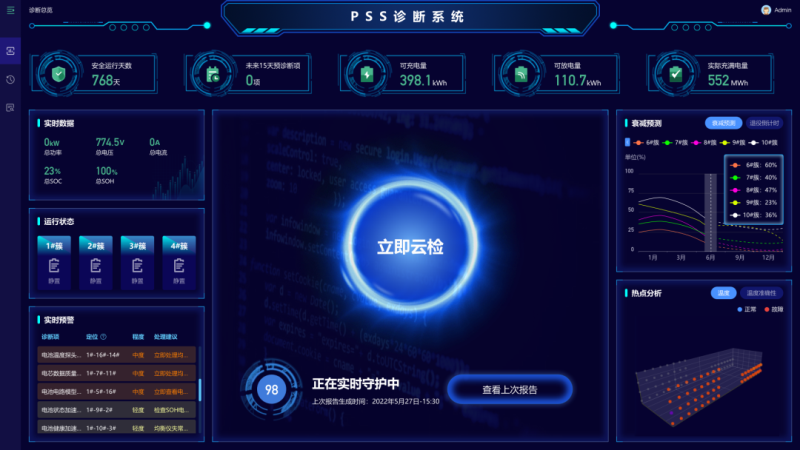 PSS系統(tǒng)支持“云邊結(jié)合”,從電芯數(shù)據(jù)中抓取容量、內(nèi)阻和自放電參數(shù)等反映電芯性能特征的電池關(guān)鍵性能參數(shù),并基于對(duì)衰老過程中鋰電池關(guān)鍵性能參數(shù)變化規(guī)律和電池知識(shí)地貌的分析,預(yù)測(cè)電芯狀態(tài)演變,能夠捕捉電池關(guān)鍵參數(shù)劣化的微先兆。針對(duì)電芯內(nèi)短路熱失控、正常老化失效等故障,提前一個(gè)月就做出預(yù)警,全方位保證移動(dòng)儲(chǔ)能多功能補(bǔ)電車用電安全。