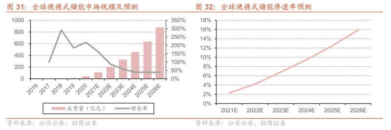 據(jù)中國化學與物理電源行業(yè)協(xié)會統(tǒng)計,2016-2020年全球便攜移動儲能市場規(guī)模由0.6億增長至42.6億,復合增速達到190%,預計到2026年可能達到882億,仍將維持高速增長。