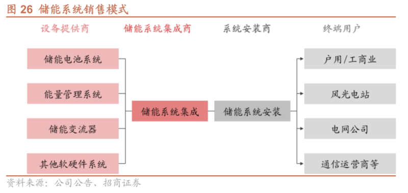 儲能系統(tǒng)銷售階段可分為一體模式(儲能電池+逆變器集成銷售)、分體模式(儲能電池、逆變器單獨配置),目前歐洲市場以分體為主。在交付系統(tǒng)安裝商后,完成終端安裝配置及調(diào)試運行。