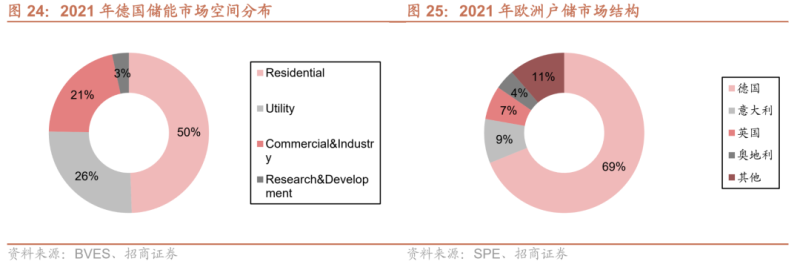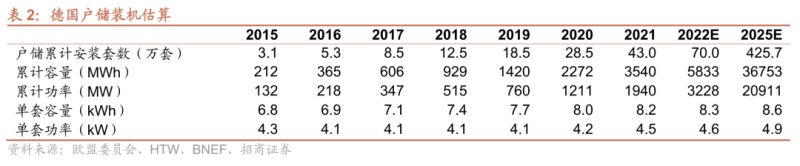 滲透率較低,潛在空間巨大。據(jù)BVES預測,2022年德國戶儲新增安裝套數(shù)有望達到27萬套,估算對應裝機1.3GW/2.4GWh。目前德國住宅公寓數(shù)目大致為4000萬套,屋頂數(shù)目約為1/4(基本穩(wěn)定,十年負荷增速低于1%),假設到2025年戶儲滲透率達到40%,則對應戶儲安裝套數(shù)超過400萬套,仍以5kW/8.5kWh的典型規(guī)格估算,累計裝機容量將達到21GW/36GWh。如果仍以德國占歐洲50-70%的份額估算,歐洲2025年累計戶儲裝機容量預計在35GW/60GWh上下。