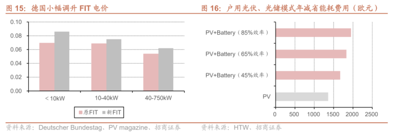 消費電價上漲,戶儲經(jīng)濟性優(yōu)化。參考目前歐洲大部分地區(qū)電價水平及光伏、儲能系統(tǒng)報價,戶用光儲LCOE已經(jīng)有明顯的成本優(yōu)勢。在市場機制允許的情況下,利用峰谷充放也有收益空間(部分分時電價地區(qū))。以德國為例,目前居民用電價格在30-40歐分,單戶年用電量在3000-5000kWh,電費支出約1000-2000歐元。而對5kW+7kWh戶儲系統(tǒng),單套設備投資額大致為1-1.5萬歐,以1200-1300h發(fā)電小時數(shù)估算,年有效發(fā)電量在6000kWh以上,除了滿足自用外,余電可以FIT電價上網(wǎng)獲取部分收益。估算大部分情況下,5-7年可收回項目投資(實際回報期除電價、設備投資等因素外,戶用電量、晝夜電量分布等也有較大影響,且不同地區(qū)提供差異化補貼,大幅縮短回收期)。