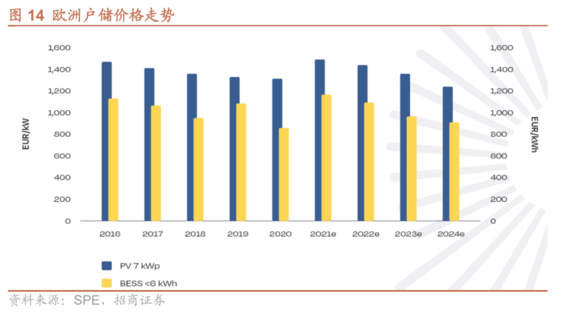 成本上,戶用光儲系統(tǒng)主要成本項目由光伏系統(tǒng)、儲能電池、變流設備構(gòu)成。2016-2020年間德國戶用系統(tǒng)成本下降24%,雖然在最近兩年由于供應鏈擾動造成了階段性的價格抬升,但預計未來整體仍將繼續(xù)下降。