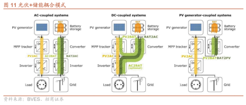 海外戶用儲能大部分與分布式光伏配套,光儲系統(tǒng)由光伏組件、儲能電池、逆變器/變流器構(gòu)成。參考屋頂資源及用戶負荷,通常光伏組件配置容量在5-20kW,電池蓄電容量在5-20kWh。依據(jù)電池、光伏組件耦合位置可分為共交流母線、共直流母線等結(jié)構(gòu)。