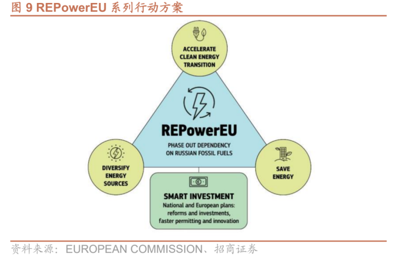 2022年5月18日,歐委會發(fā)布REPowerEU方案,以期提升能源供給獨立性,減少對俄羅斯進口能源依賴。具體的執(zhí)行方向包括:1)節(jié)約能源,提升能源效率;2)推動向可再生能源轉(zhuǎn)型;3)多元化能源進口;4)并將為上述方向提供資金、政策支持,預計至2027年,REPowerEU將增加2100億歐元投資,至2030年達到3000億歐元。