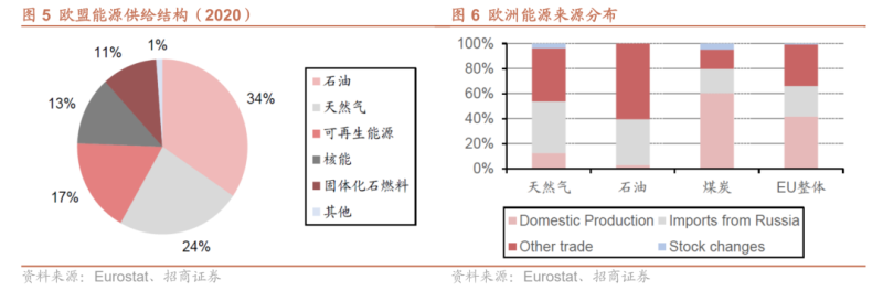 歐盟能源供給仍然以油氣為主,2020年化石能源占比接近70%(其他主要為可再生能源、核能等)。