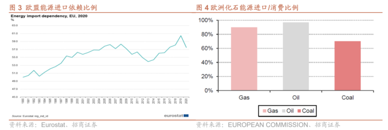 歐洲傳統(tǒng)化石能源進口依存度偏高,并在不斷上升:1990-2019年間,歐盟能源消費量增加0.7%(2020年下降8.1%),需求規(guī)模整體企穩(wěn),同期能源生產(chǎn)量下降22.7%(2020年下降7.1%),2020年歐盟能源進口比例達到57%,其中天然氣、石油、煤炭消費量中進口比例分別達到90%、97%、70%,而俄羅斯又是歐洲能源的第一大供應商,2020年由俄羅斯進口能源在歐盟占比達到24.4%。