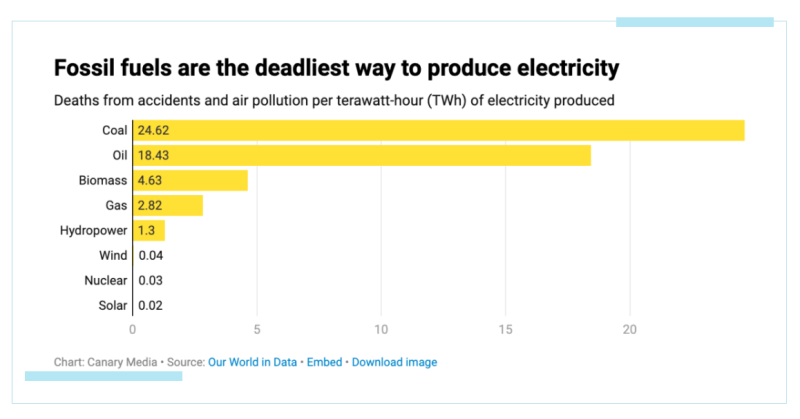 中國儲能網(wǎng)訊:我們說化石燃料是致命的,這不僅僅是因?yàn)樗鼈儗?dǎo)致了氣候危機(jī)。每單位發(fā)電量中,煤炭和石油造成的死亡人數(shù)遠(yuǎn)遠(yuǎn)超過可再生能源或核能——這只是計(jì)算空氣污染和事故造成的死亡人數(shù),而沒有計(jì)入氣候變化引發(fā)的災(zāi)害造成的死亡人數(shù)。