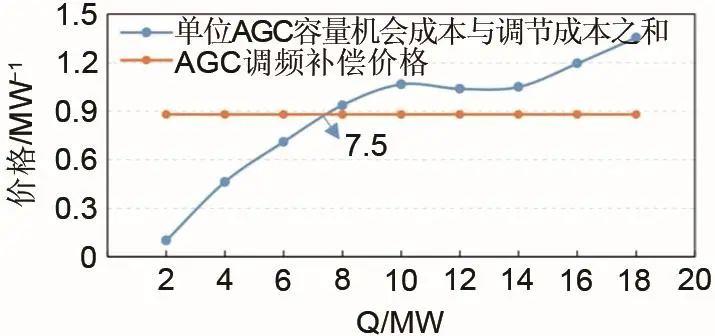 儲能系統提供AGC調頻的邊際機會成本隨申報容量的增加而增加。當AGC調頻容量的邊際機會成本與AGC調節(jié)成本之和等于AGC調頻補償價格時,此時儲能系統在電能量市場與AGC市場中的總收益達到最大,對應的容量即為最優(yōu)AGC調頻申報容量。當AGC補償價格很大時,儲能系統全部容量將用于提供AGC服務。